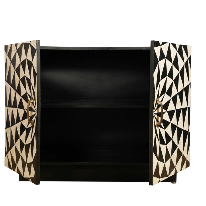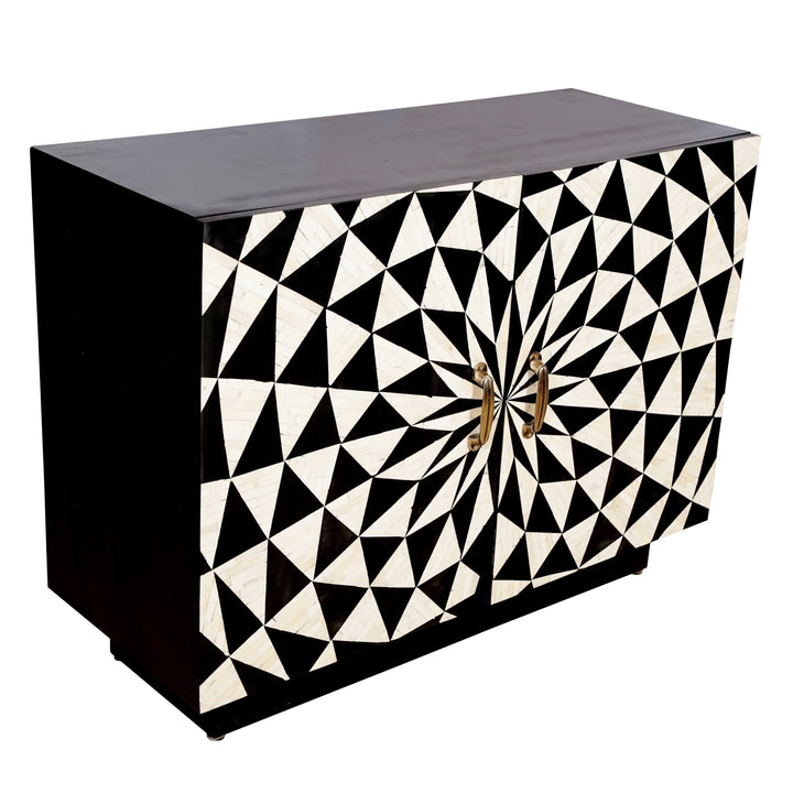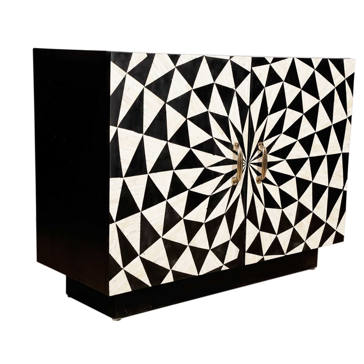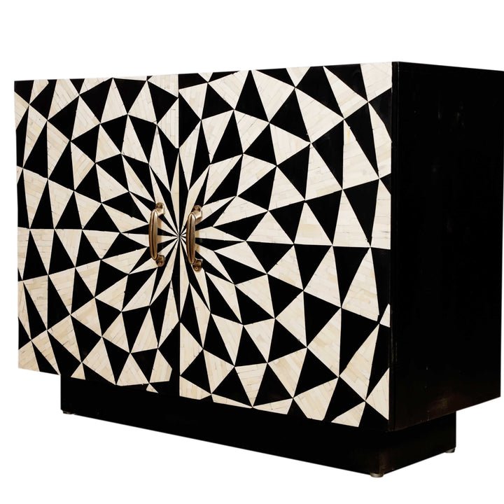 This beautifully made versatile four-part cabinet with striking inlay work showcasing the mesmerizing pattern. This multipurpose piece elevates any living space, serving as a stylish bar, crockery cabinet, or functional storage . The captivating spiral geometric design adds sophistication and serves as a focal point. Meticulously crafted, the Tanish cabinet beautifully combines aesthetics and functionality, making it a must-have for modern homes.